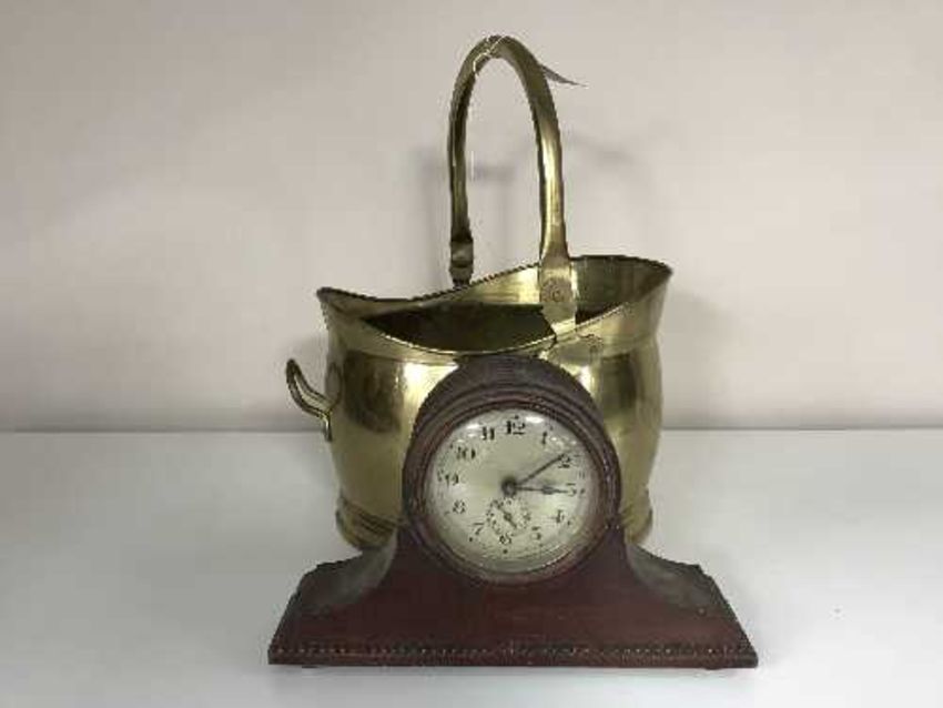 A brass coal bucket together with an early twentieth century mahogany mantle clock