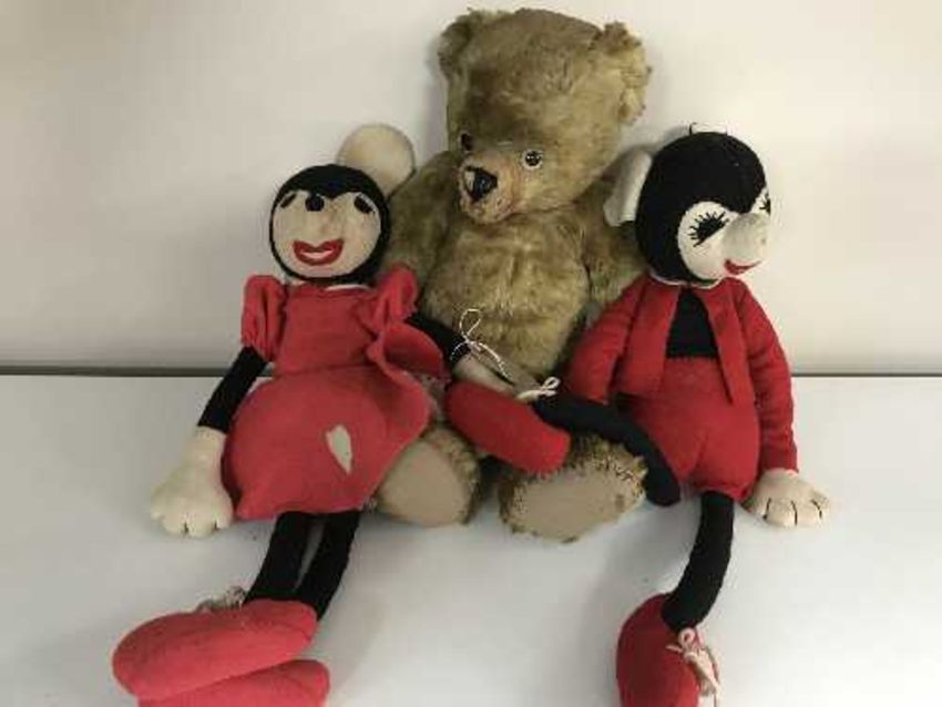 A basket of vintage teddy bear and Mickey & Minnie mouse soft toy