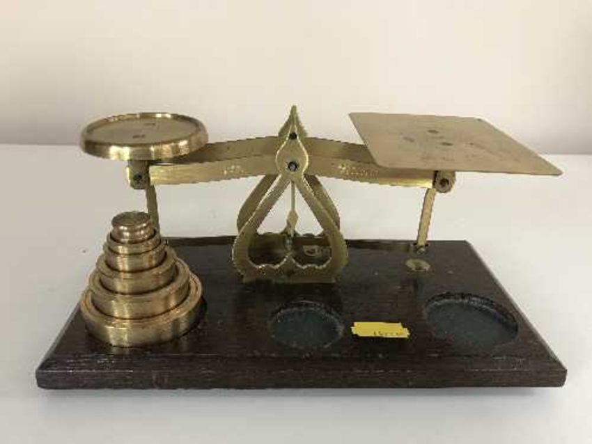 A set of brass postal scales with weights