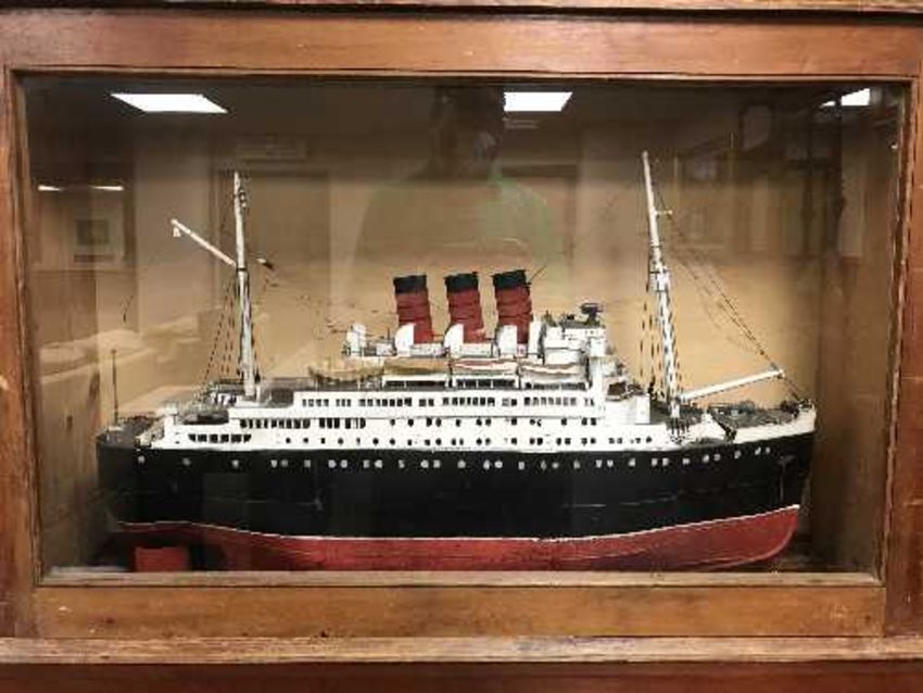 An early 20th century scratch built model boat, The Queen Mary, in specially constructed pine display box