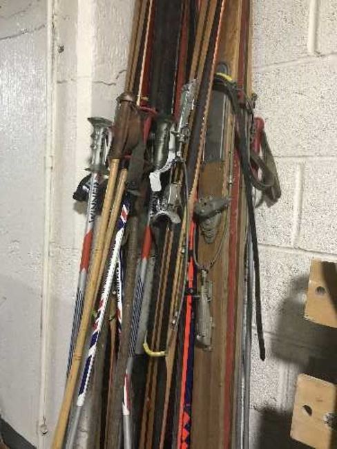 A quantity of vintage skis and poles, box of three pairs of vintage leather ski boots and two pairs of goggles