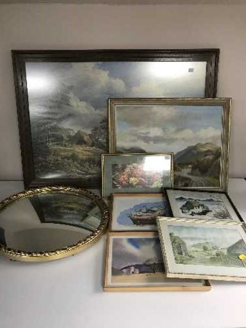 A box of assorted pictures and prints - Alhim print, gilt porthole mirror, etc
