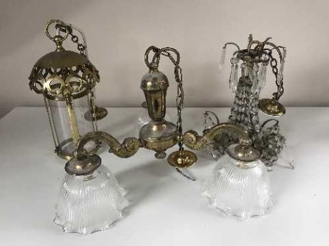 An early 20th century brass ceiling light with brass drops, lantern and a three way light fitting with glass shades