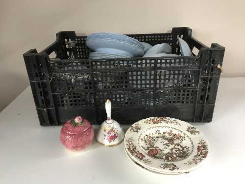 A box of part Meakin dinner service, part Ducal dinner service, preserve pots, glass decanters etc