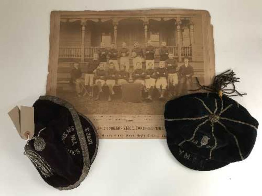 Two late 19th century South Shields football caps and a South Shields YMCA Football Team photograph