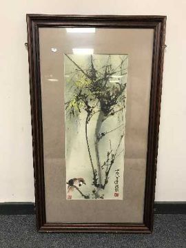 Chinese school : A bird on a branch, watercolour, signed. 31 cm x 78 cm, framed.