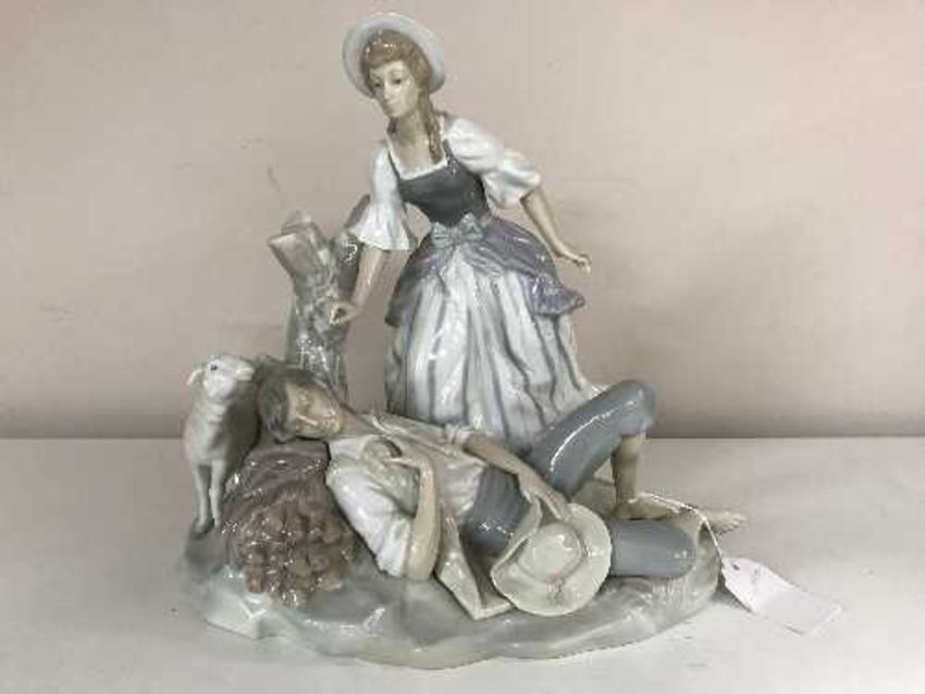 A Lladro porcelain group, a lady standing over a man sleeping against a tree stump, height 28cm