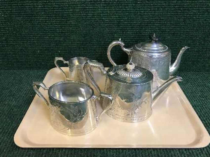 Two trays of plated four piece tea services, candlesticks, plated candelabra, etc