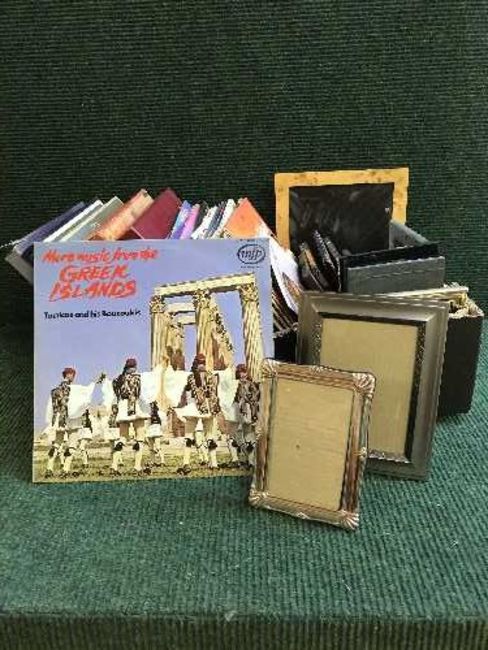 A box of assorted photograph frames, LP records, leather briefcase etc
