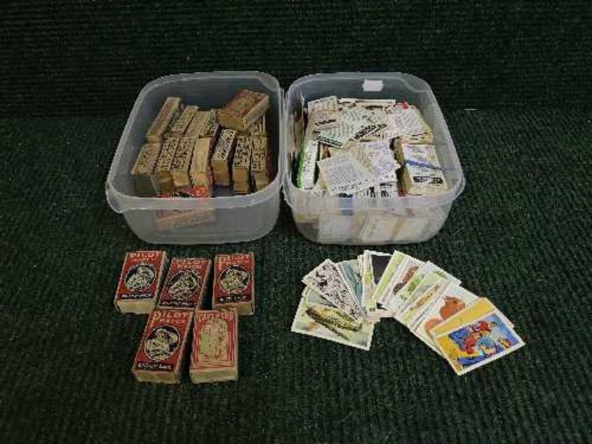Two boxes of cigarette cards and match boxes