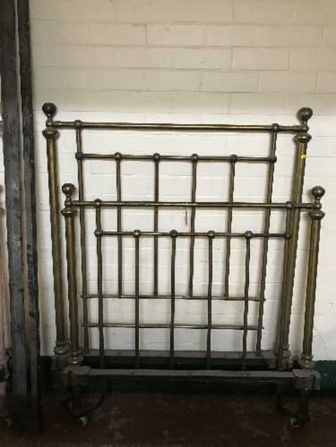 A Victorian brass bed with irons