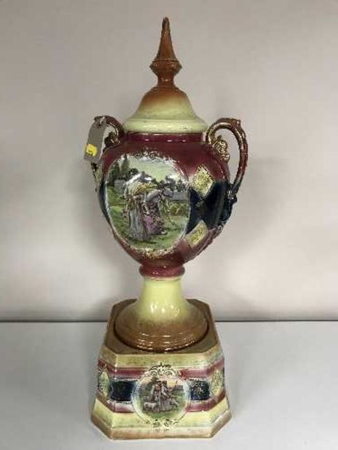 A Victorian transfer printed lidded vase on stand