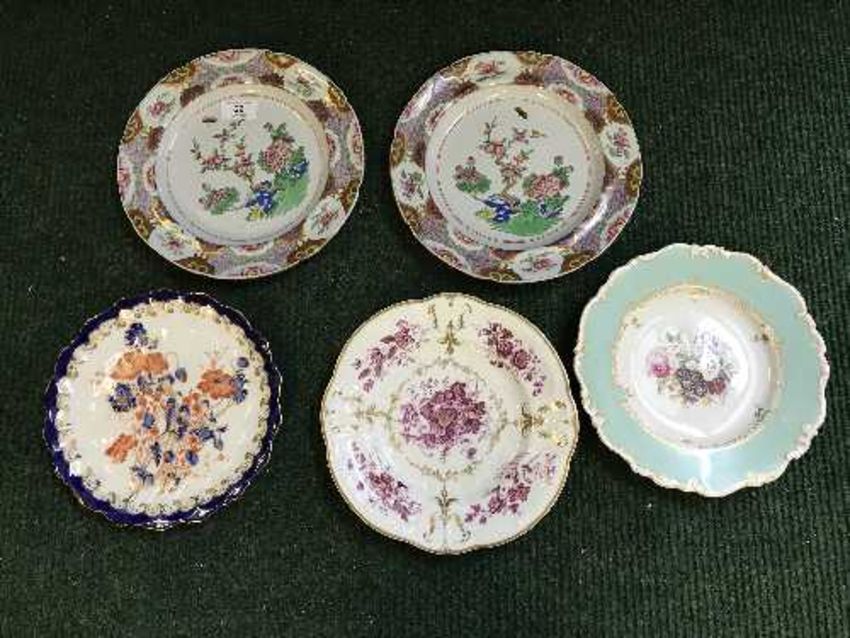 A pair of nineteenth century Spode china cabinet plates, pattern 2647, diameter 24.5 cm, together with three further nineteenth century plates. (5)