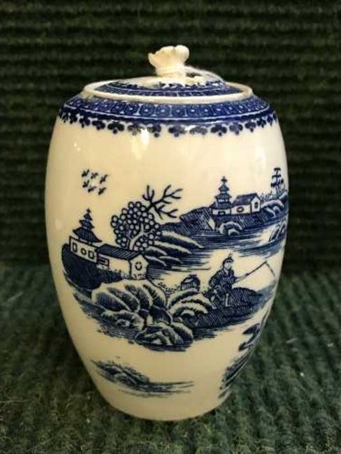 An eighteenth century Caughley china blue and white lidded jar, height 12 cm.