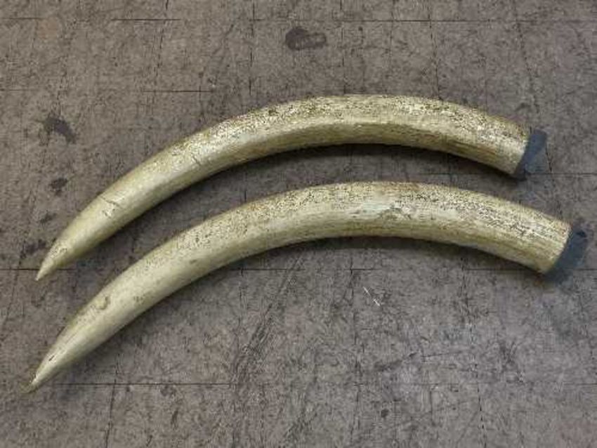 An enormous pair of reproduction composition elephant tusks (2)