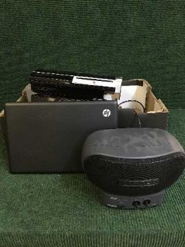 Two boxes of Advent lap top, Bluetooth wireless speakers, camera tripod, PS3 etc