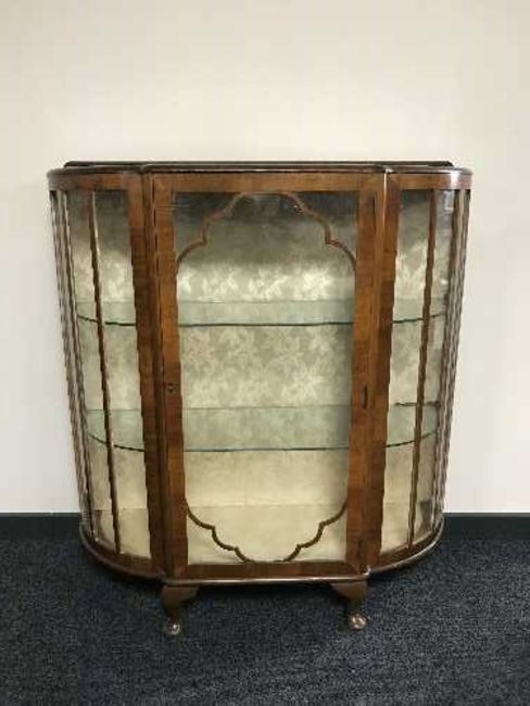 A walnut display cabinet on claw feet