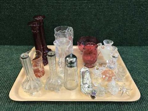 A tray of cranberry glass milk jug and sugar basin, sifter, silver rimmed fluted vases, miniature metal tea service on tray etc