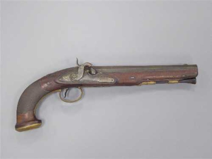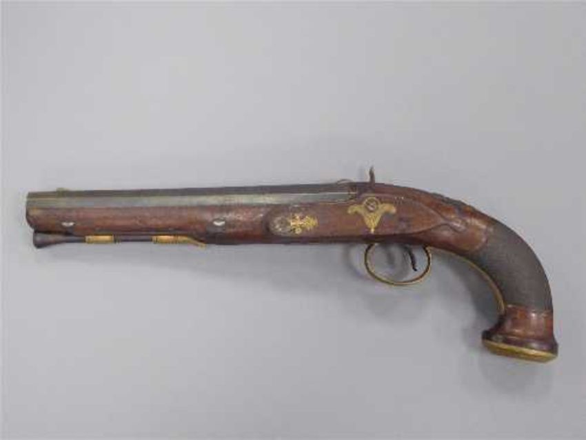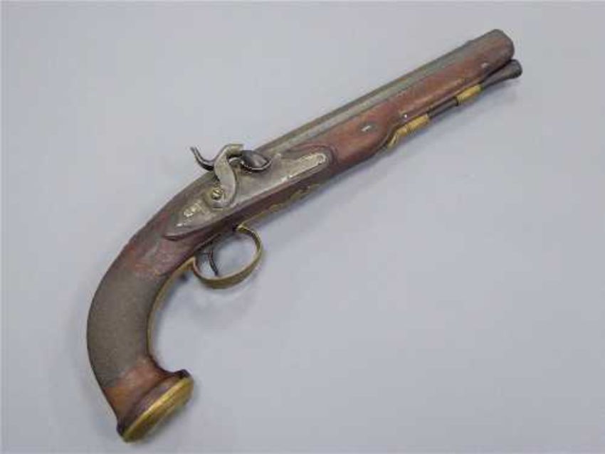 An early 19th century officer's percussion cap pistol, converted from a flintlock, with 22cm octagonal damascus barrel, horn-tipped wood ramrod, walnut stock with brass furniture and chequered grip.