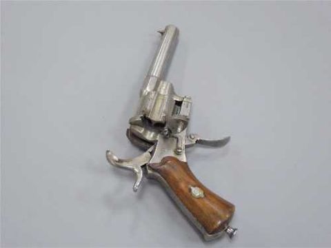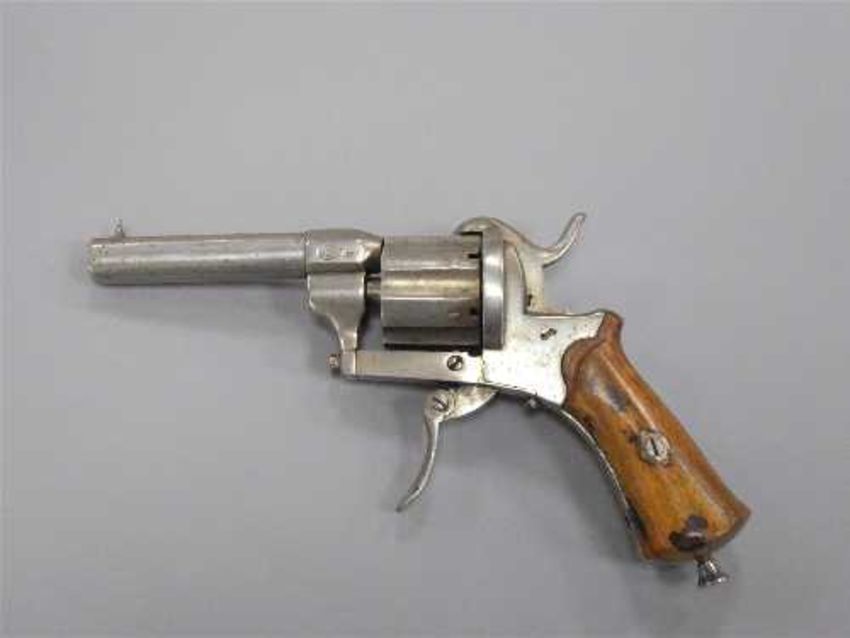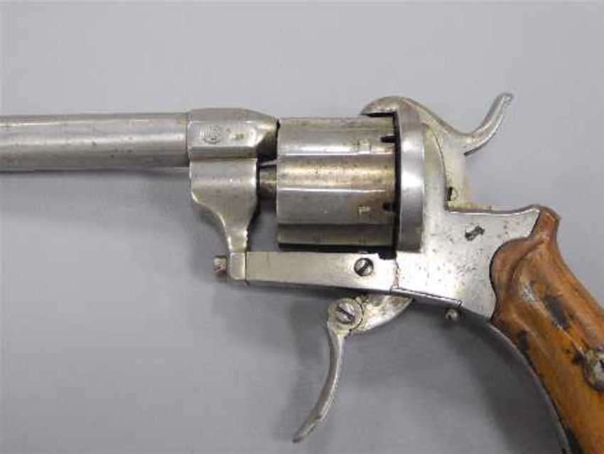 A late 19th century Belgian pinfire double-action revolver, the 7.5cm barrel with Liege proof mark, folding trigger and two-piece walnut grip.