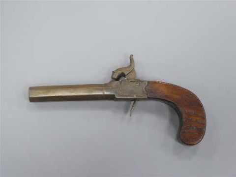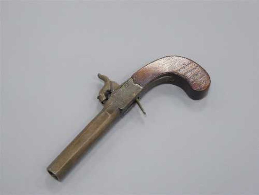 An early 19th century percussion cap pocket pistol, the octagonal 8cm barrel with proof marks, concealed trigger and walnut two-piece grip.