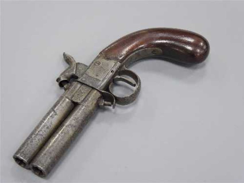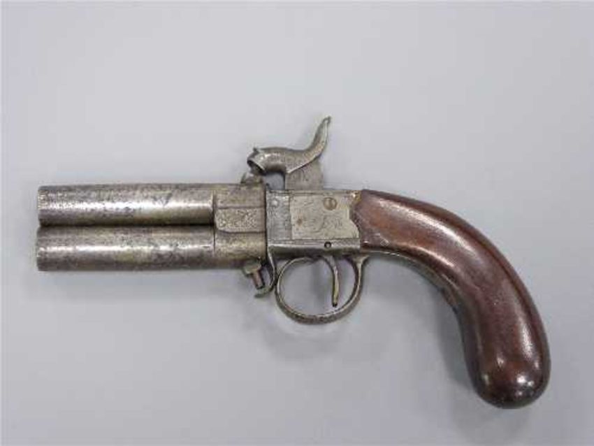 An early 19th century rotating barrel over-under percussion cap pistol, the twin 6.25cm barrels with proof marks, each with a cap-nipple, the two barrels rotating 180 degrees, with a foliate engraved lock and walnut grip.