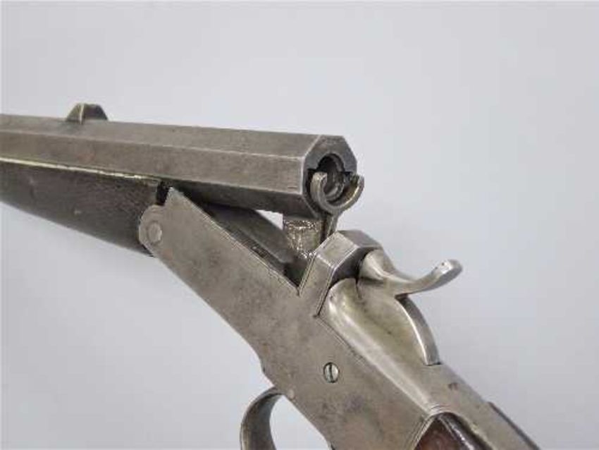 A 19th century rim-fire target pistol, by James Burrow of Preston, with a 27.5cm octagonal barrel and walnut grip.
