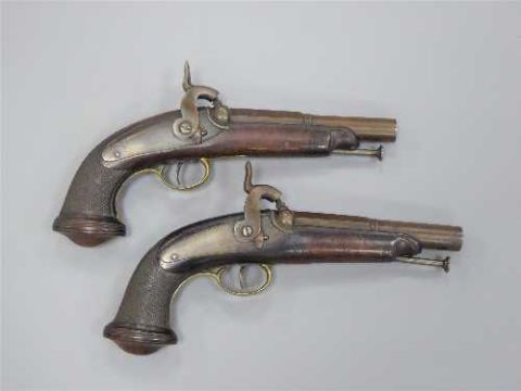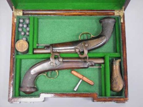 A pair of early 19th century percussion cap pistols, the 15cm barrels octagonal at the breach, with steel ramrods, brass trigger guards and chequered walnut grips. Contained in a mahogany, baize-lined pistol box with American copper powder flask, percussion caps, lead shot etc.
