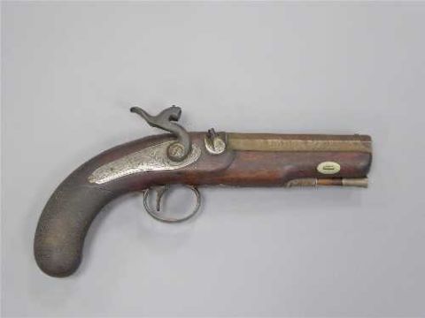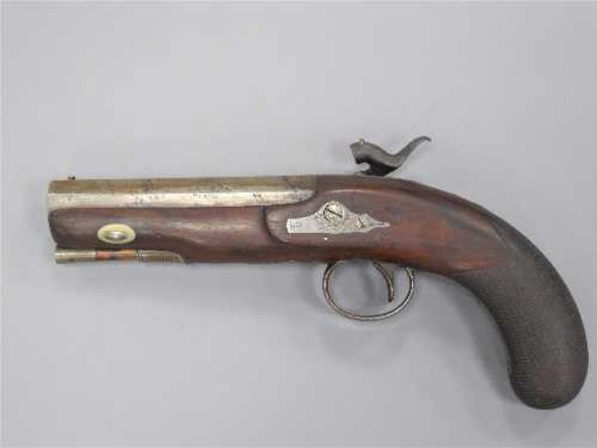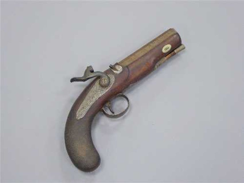 An early 19th century percussion cap overcoat pistol, with 12.5cm octagonal barrel, steel tipped ramrod, foliate engraved lock and chequered walnut grip.