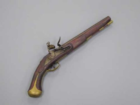 An early 19th century long barrel flintlock pistol, with 30.5cm barrel, walnut stock with brass furniture and brass tipped ramrod.