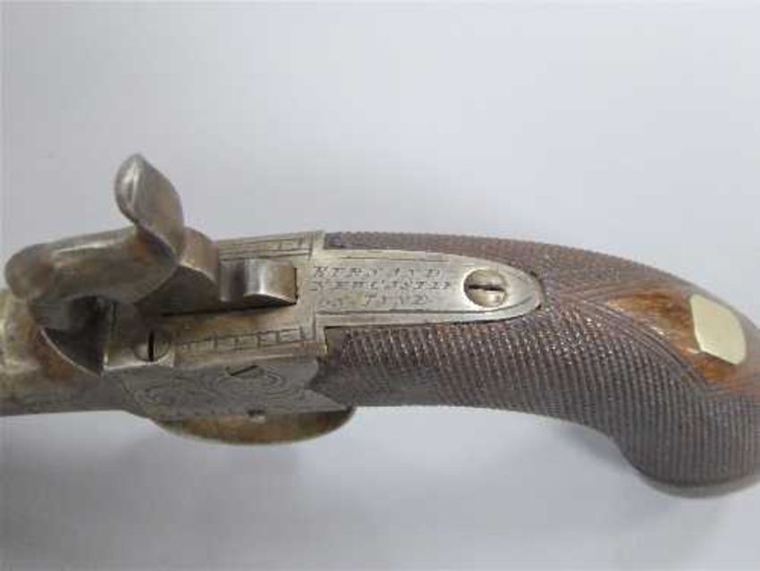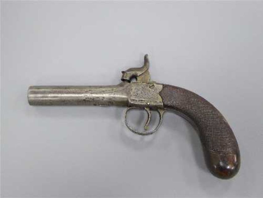An early 19th century percussion cap pocket pistol, by Richard Burnand of Newcastle Upon Tyne, circa 1820, the 7.5cm screw off barrel with proof marks, with chequered walnut slab butt.