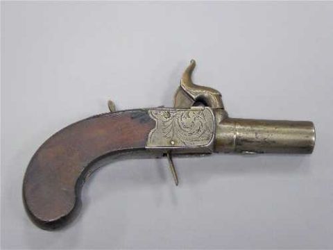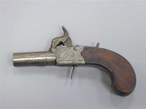 A 19th century percussion cap pocket pistol, by Wilmot & Roberts, with 4cm screw off barrel, concealed trigger, thumb safety and a walnut slab grip.