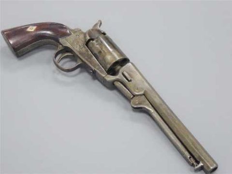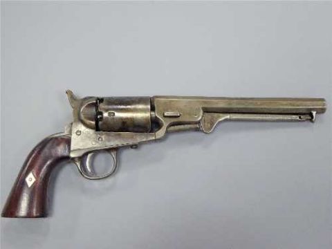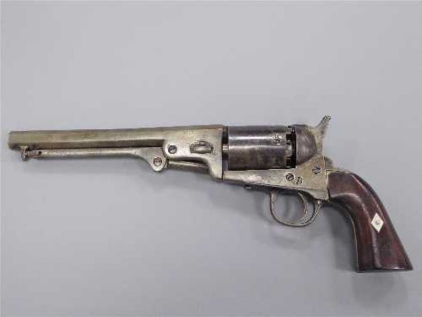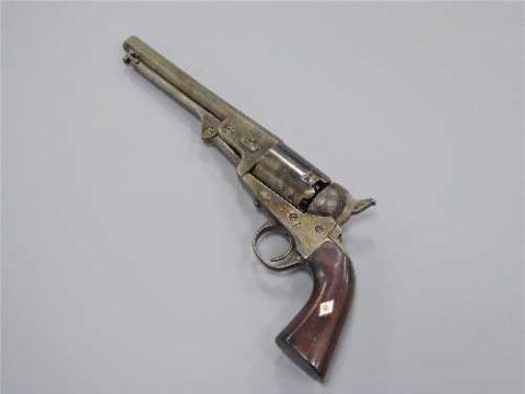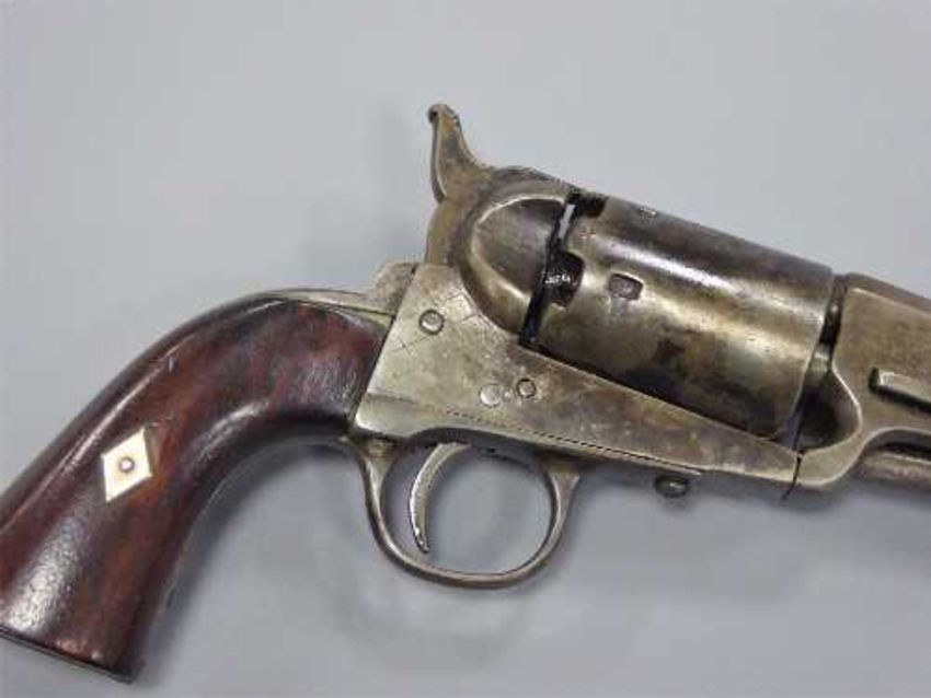 A 19th century Model 1851 Navy percussion cap revolver, the 18cm octagonal barrel with folding ramrod, walnut two-piece grip with inlaid steel chevron to each side, six-shot cylinder with proof marks, underside of receiver stamped 45723.