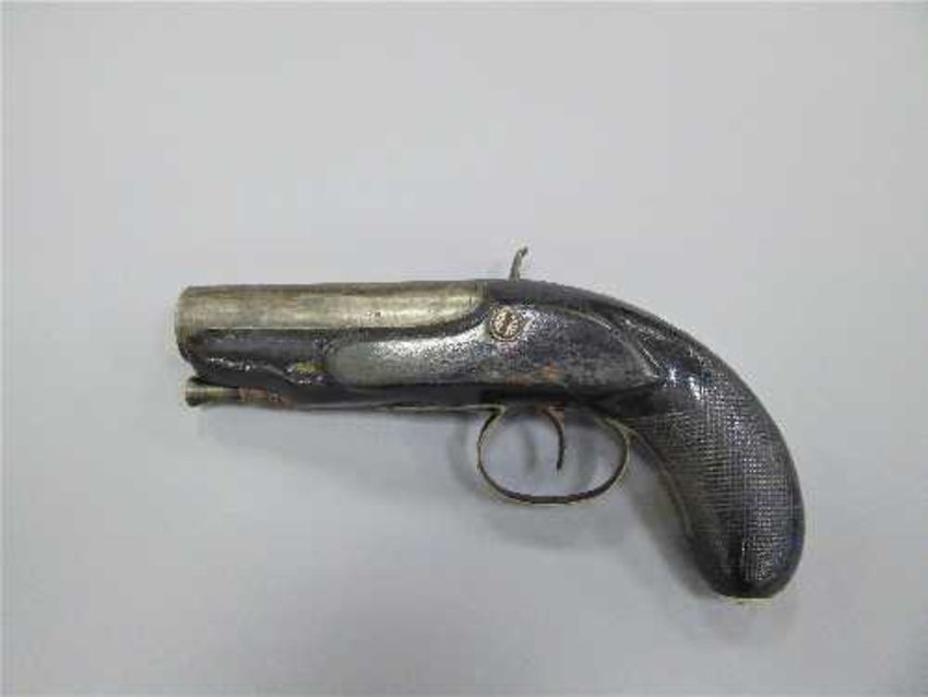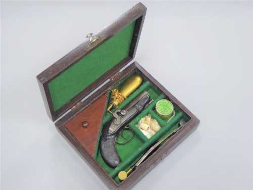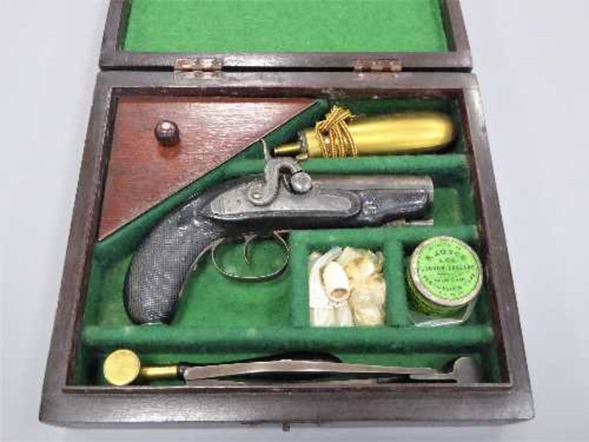 A 19th century percussion cap 'manstopper' pistol, signed W. True, .75 calibre, 9cm barrel, with ramrod, in a green baize lined case with accessories to include a brass powder flask, bullet mold, powder measure, quantity of lead shot etc.
