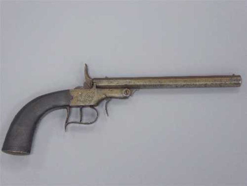 A 19th century rim-fire target pistol, with 20.5cm octagonal barrel, forward trigger to open the breach, swept trigger guard and chequered grip.