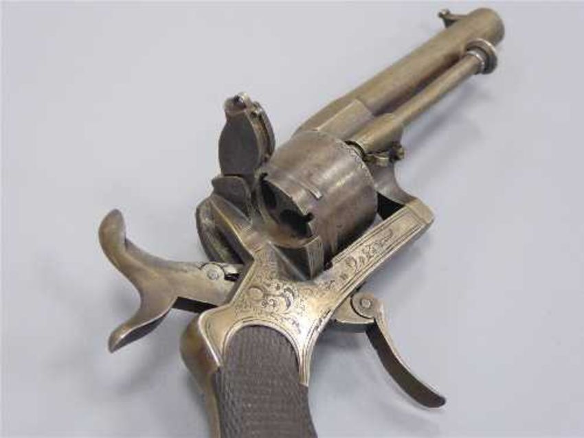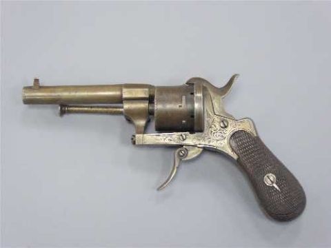 A late 19th century pinfire revolver, the 8.5cm barrel with ejector rod, six-shot cylinder with numerous proof marks and side loading gate, with chequered two-piece grip.