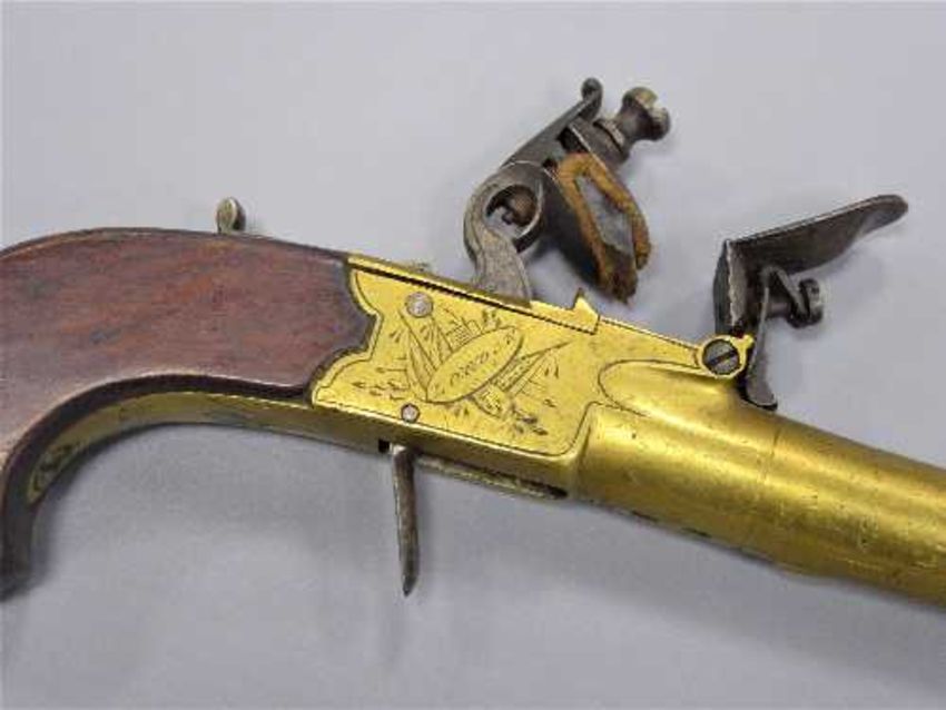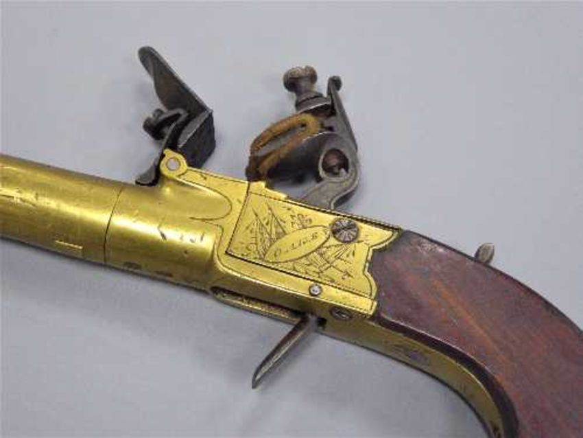 A late 18th century flintlock pocket pistol by Oakes of London, circa 1780, the 5.5cm screw off brass barrel with proof marks, with concealed trigger, thumb safety and walnut slab grip.