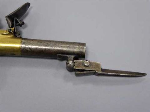 A late 18th/early 19th century flintlock pocket pistol by Patrick of Liverpool, circa 1800, the 6cm screw off barrel with folding bayonet beneath, brass lockplate with maker's name and martial decoration, thumb safety and walnut slab grip.