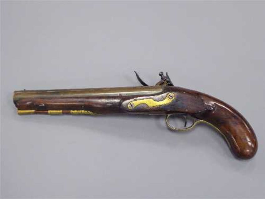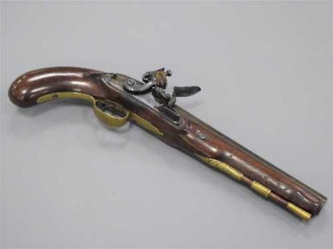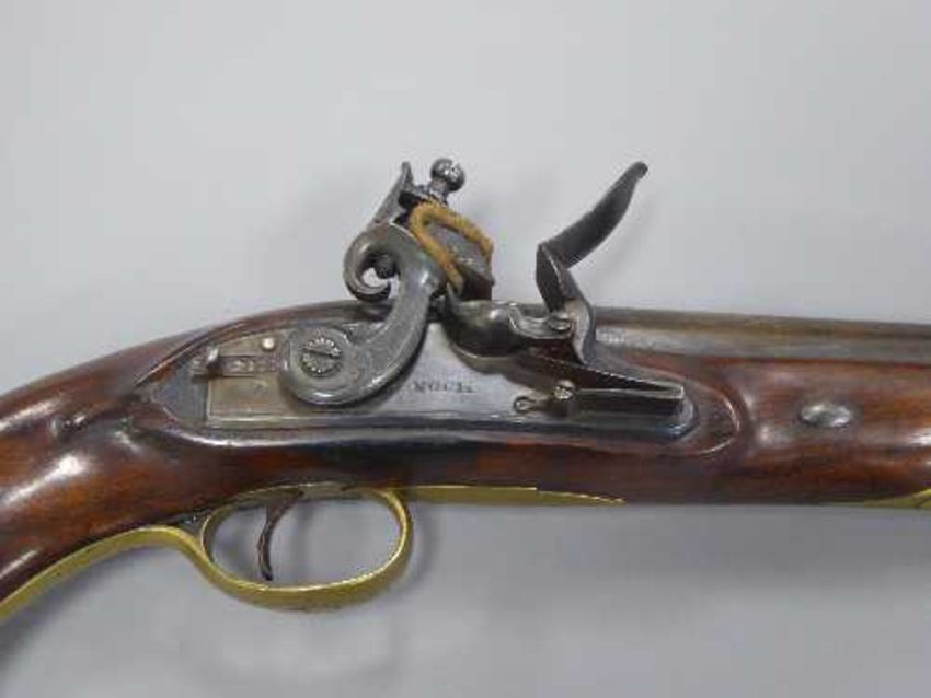 A good late 18th/early 19th century officer's flintlock pistol, by Henry Nock of London, the 22.5cm browned steel barrel stamped LONDON and with proof marks, with rounded walnut grip and brass tipped ramrod.