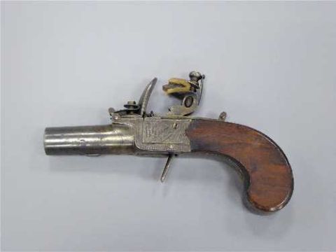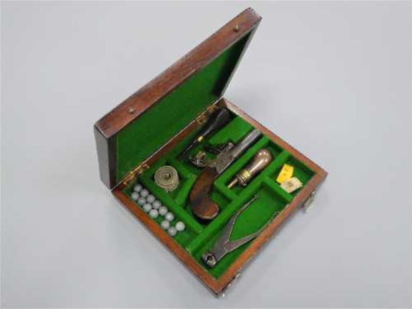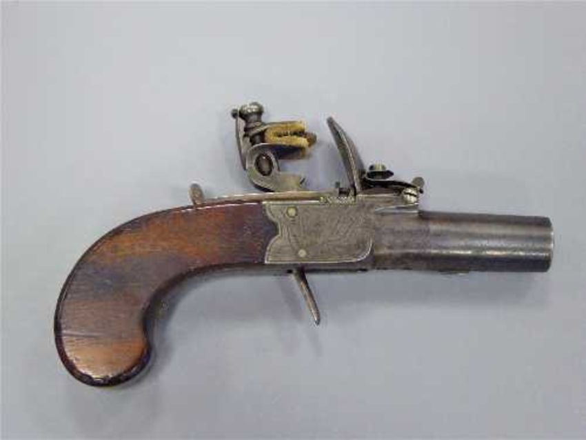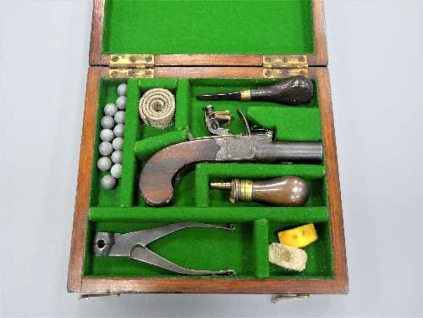 An early 19th century flintlock pocket pistol, the lockplate signed Rooke, Wigton, with a 3.5cm screw off barrel, concealed trigger and thumb safety, the walnut slab grip with inlaid white metal chevron, in a green baize lined case with accessories to include a small powder flask by Sykes, bullet mold, screwdriver, quantity of lead shot etc.