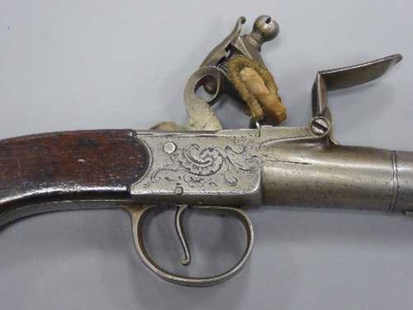A mid-18th century 'Queen Anne' flintlock pocket pistol, by T. Cranmer, the lock engraved with maker's name and martial decoration, the 6cm screw off cannon barrel with proof marks, with a slender walnut slab grip.