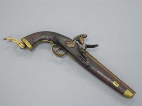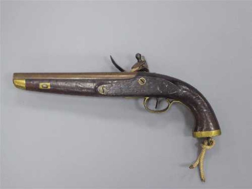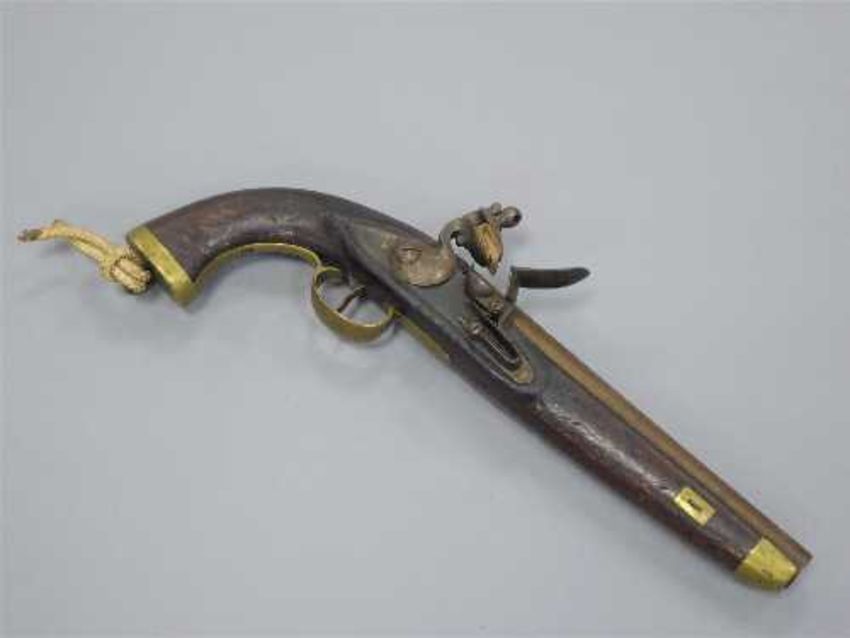 A late 18th/early 19th century flintlock pistol, with 23cm barrel and walnut stock with brass-capped pommel with steel lanyard ring.