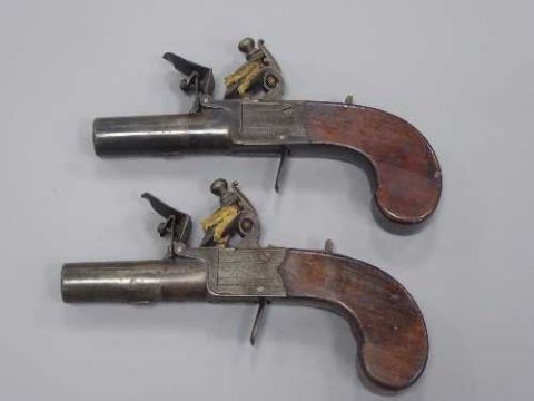A pair of late 18th century flintlock pocket pistols by Johnson & Collins, each lock engraved with maker's name and martial decoration, with 4.25cm screw-off browned steel barrels, concealed triggers, thumb slide safety and walnut slab grips.