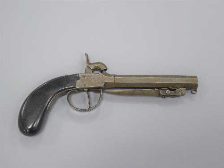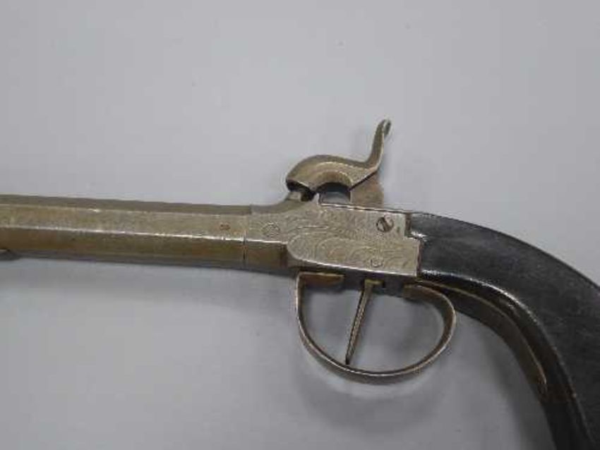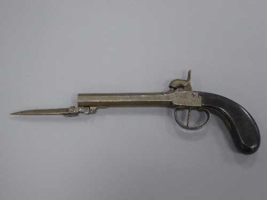An early 19th century Belgian percussion cap pocket pistol, the 10cm octagonal steel barrel with undersprung bayonet, the lock with Liege proof mark and engraving, with stained walnut slab grip.