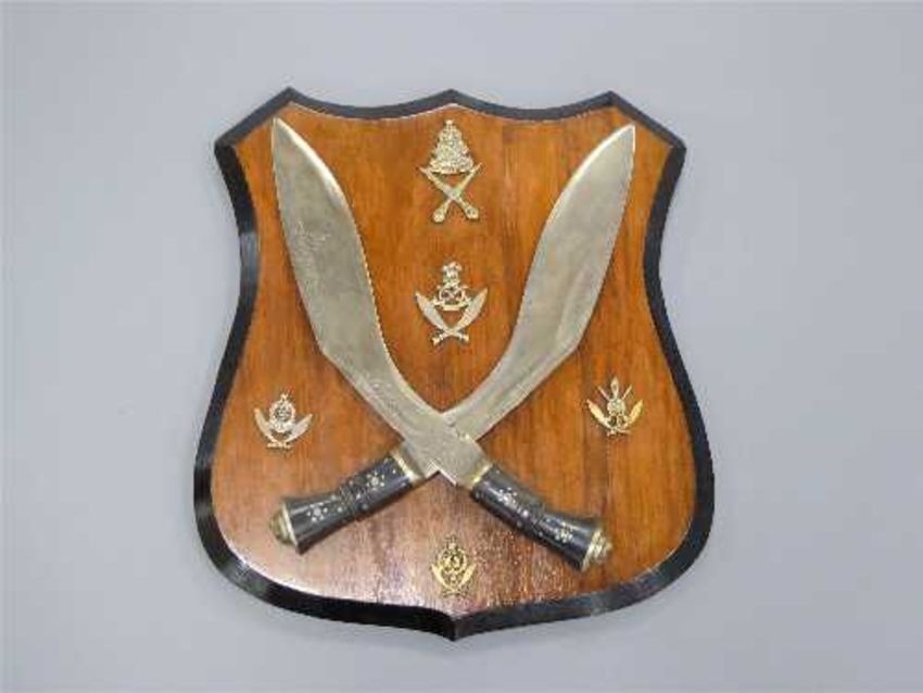 A pair of decorative Kukri knives mounted on a shield plaque.