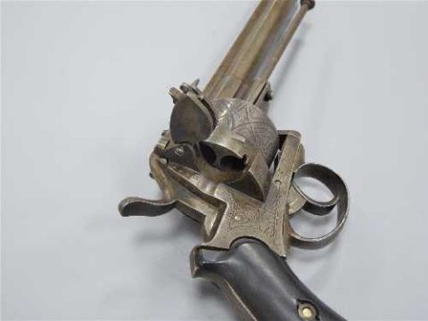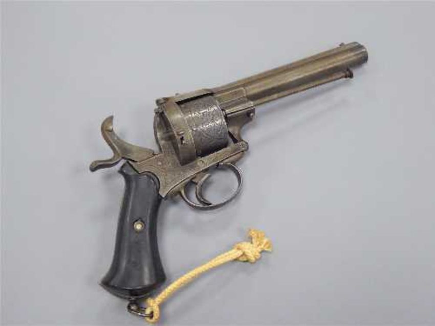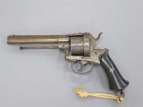 A late 19th century double-action pinfire revolver, the 14cm barrel with ejector rod underneath, the six-shot cylinder with foliate engraving and side loading gate, the ebonised two-piece grip with steel lanyard ring.