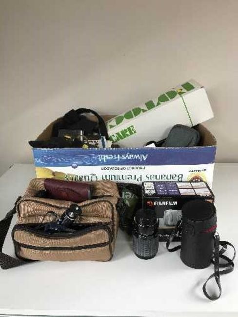 A box of cameras and equipment, flashes, tripod etc