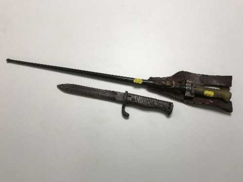 A WWI spike bayonet in scabbard with holster and a smaller bayonet of the same period
