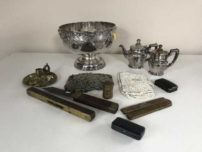 A crate of silver plated punch bowl, jewellery boxes, old rulers, mesh purse, brass chamber stick etc