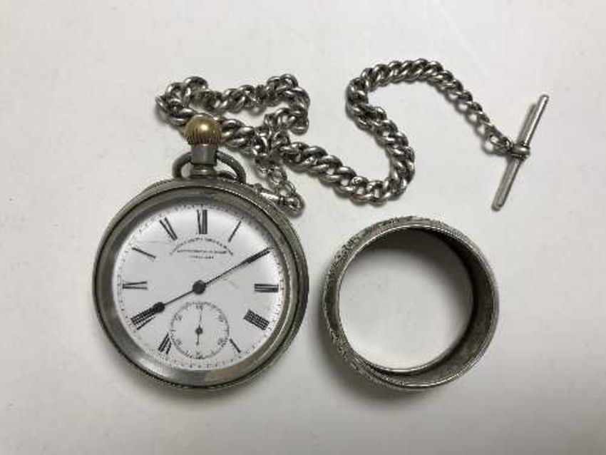 A pocket watch, retailed by G. Parkin, Newcastle, upon a silver Albert chain with t-bar, together with a silver napkin ring.
